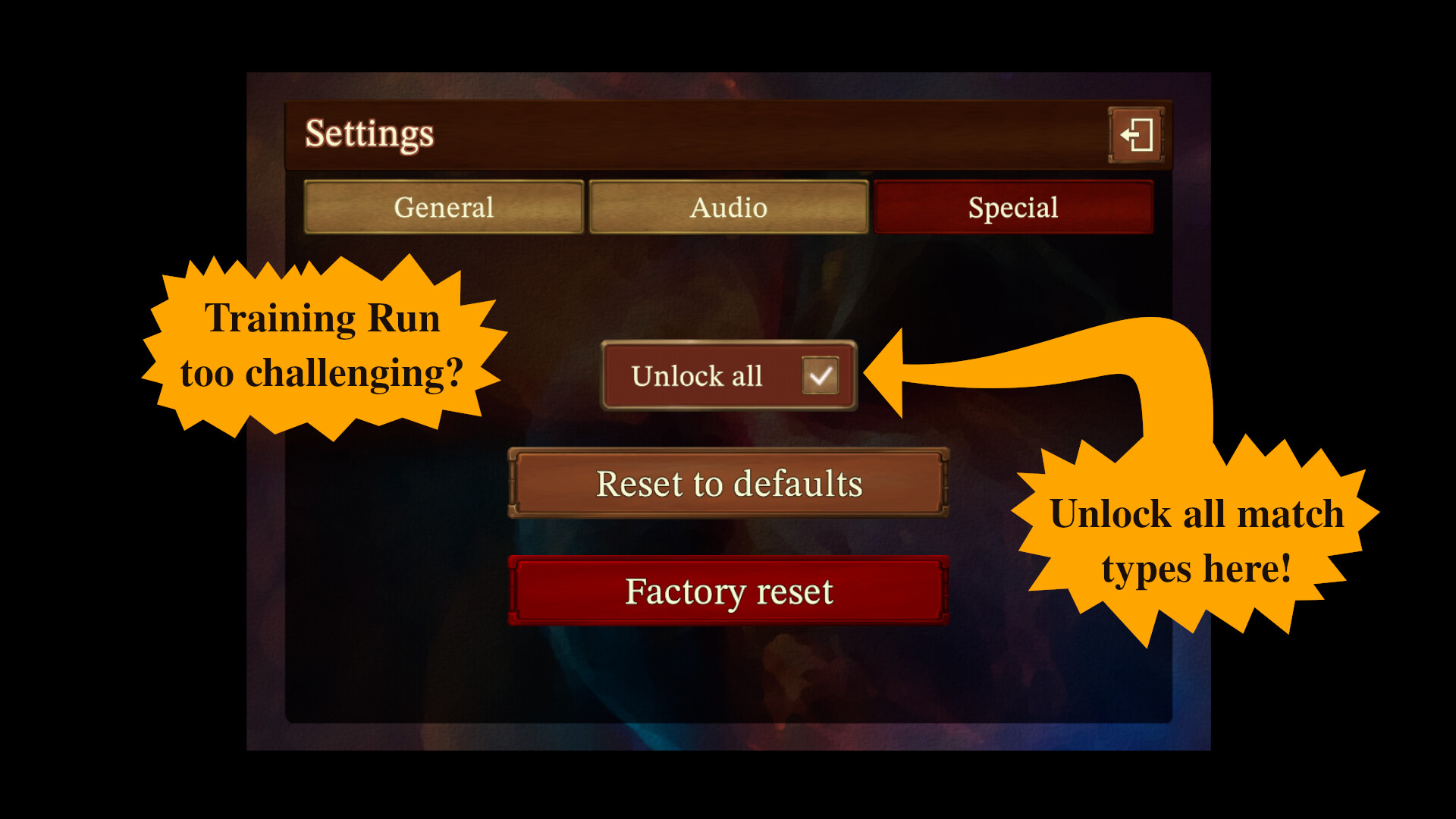 Did you find the Training Run too challenging? You can "Unlock all" in the Special section of the Settings Menu, to make all Training Run challenges optional, and unlock all of the Solitary Memory match types immediately!